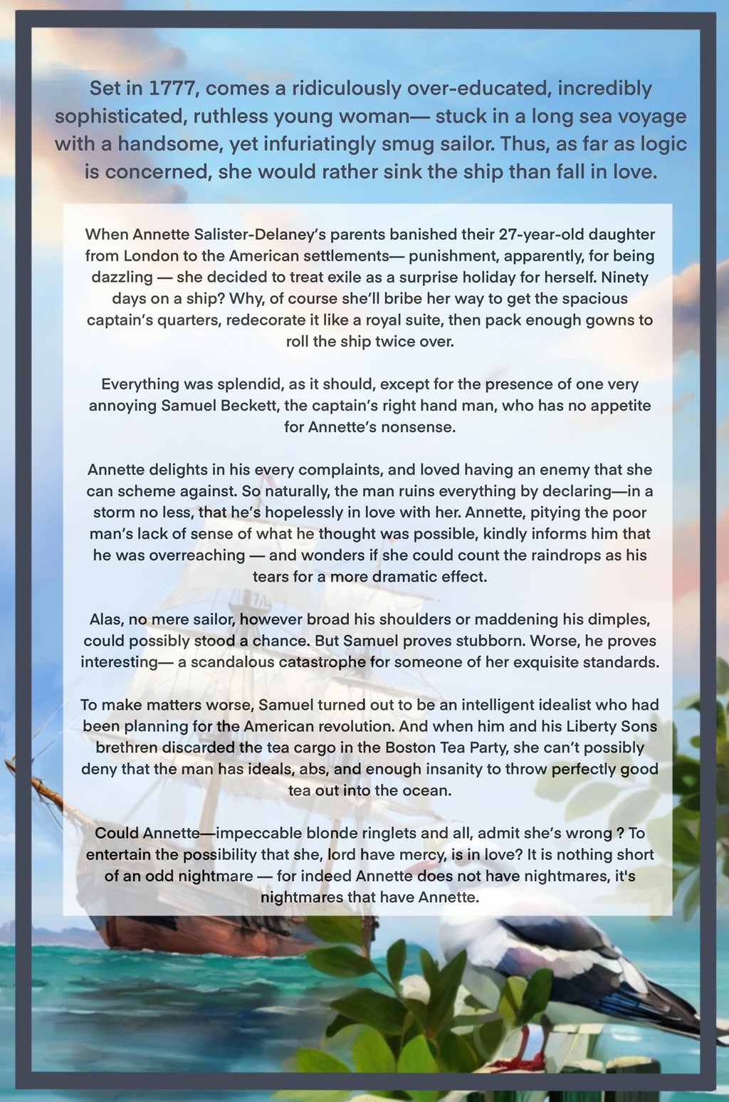Comparable Title : A mix of a very Jane Austen (reverse-gender) Pride & Prejudice (proud & rich female lead, stubborn & handsome male lead) meets the historical fiction style of Hamilton meets the lightheartedness romance of The Bridgerton Books (20+ million copies sold in the US)